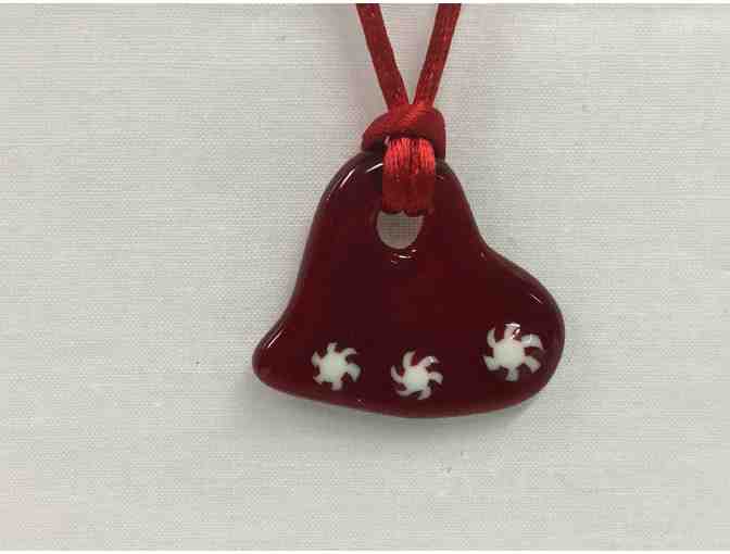 Red heart made by using glass frit (small pieces of glass) and peppermint millefiori. Kiln fired. Hello, Valentine's Day!