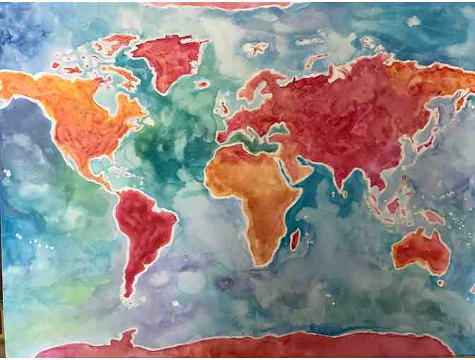 One of a kind large map acrylic painting on canvas created by GRACE Seniors Emma Cole, Corey Zucco, and Reece Goodman. The artists watered down the acrylic paint to create a water color effect.