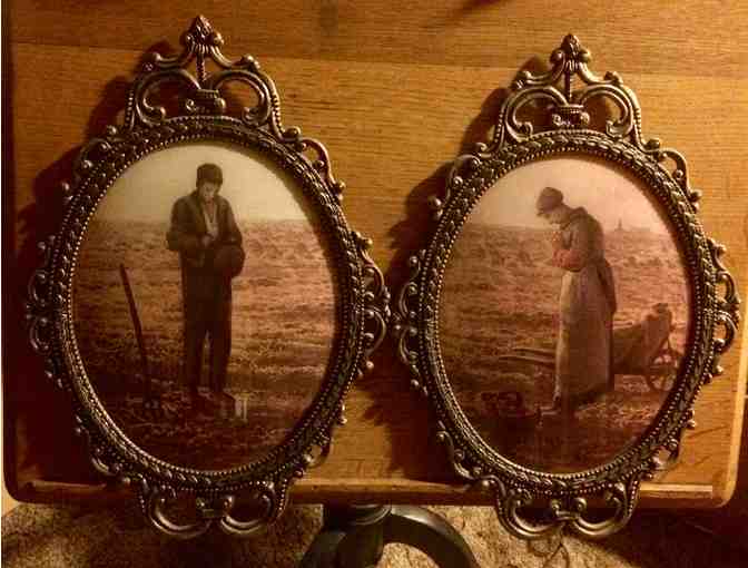 Lovely pair of Jean-Francois Millet prints taken from his famous painting "The Angelus". They are framed in ornate gold metal with convex glass and backed in velveteen. They are in excellent condition with very little wear to the velveteen backing.