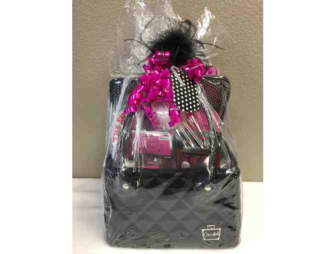 Pamper yourself with this mani-pedi gift basket featuring a nail care tool kit, clear-coat, a buffering nail block, a foot exfoliator paddle, body sugar scrub, professional quality nail polish remover, drying spray, cotton rounds, and four colors of nail polish all nestled inside a stylish black tote.