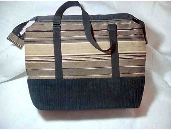 Handmade Tote Bag. Tan and black striped body with black corduroy bottom and black nylon strapping handles. Approximately 16" wide x 12" tall x 4.5" deep. Heavy duty zipper closure. Fully lined with one internal pocket.