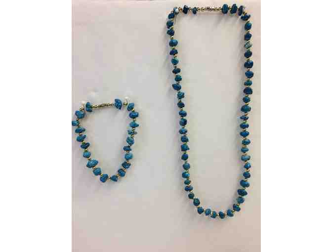 Set of beautiful turquoise and gold beaded necklace and bracelet. Necklace about 16" long.