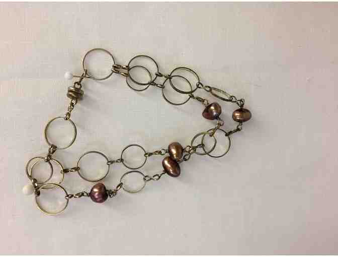 This delicate bracelet is adorned with copper-toned natural pearls. Magnetic clasp makes it easy to wear. For a delicate wrist.