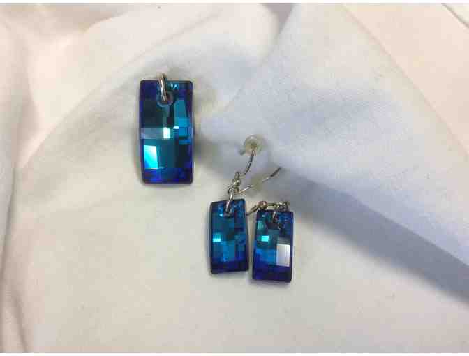 A pair of pierced earrings with rectangular shaped, faceted and very sparkly blue glass stones. The pendant comes without a chain but will work well as a slider. A stunning set!