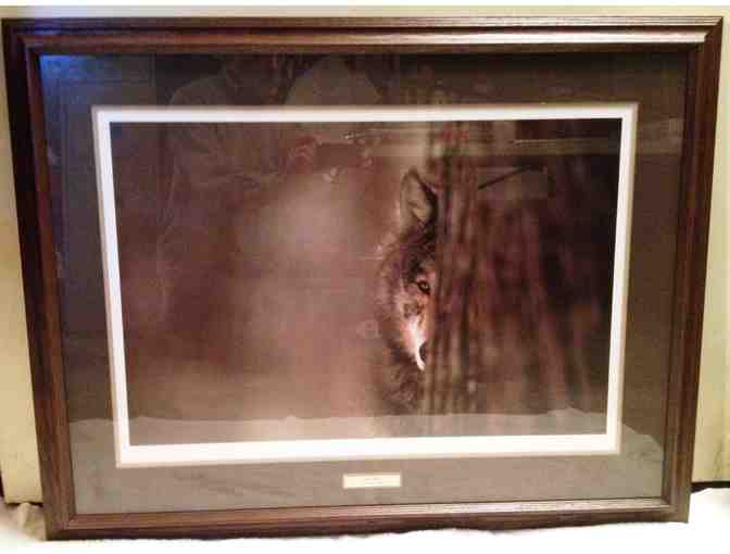 Framed (37" x28"), photographic print (26" x17") of "Gray Wolf" by Jim Brandenburg, including certificate of authenticity. With 2" dark oak-finish molding and double matting with dark brown outer mat, signed (1782 of 19500).