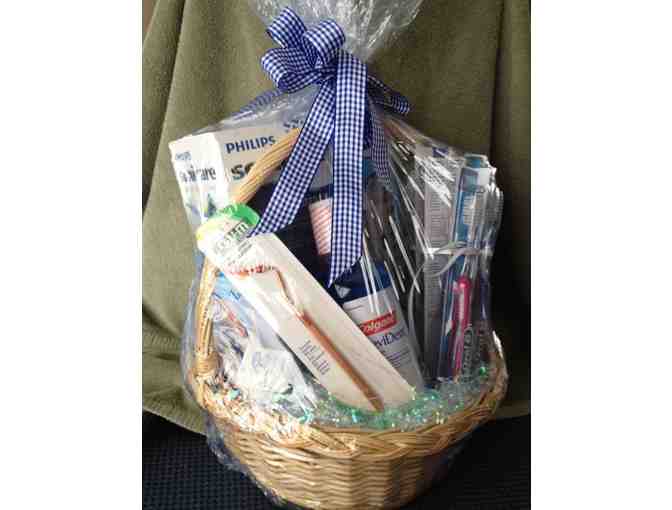 Oral hygiene gift basket including Sonicare toothbrush, 12 brushes, 3 children`s, toothpastes, oral rinses, miscellaneous items. Donated by Easton Smiles.
