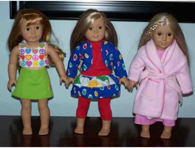 Homemade doll clothes for 18” dolls (i.e., American Girl & Our Generation). Doll not included. Fleece belted robe & night gown, skort & top, knit top & leggings with skirt & jacket. 8 pieces.