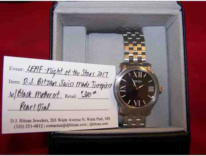 This Beautiful D.J. Bitzan Swiss Made Timepiece has a Black Mother of Pearl Dial.