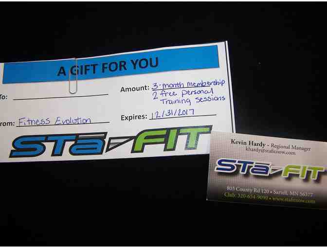 This certificate entitles the bearer to a 3-month membership to Sta-Fit and 2-Free personal traiing sessions. A great invitation to personal fitness!