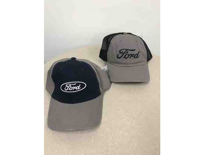 This set of Ford baseball caps includes a navy blue/gray cap and a gray/black cap.