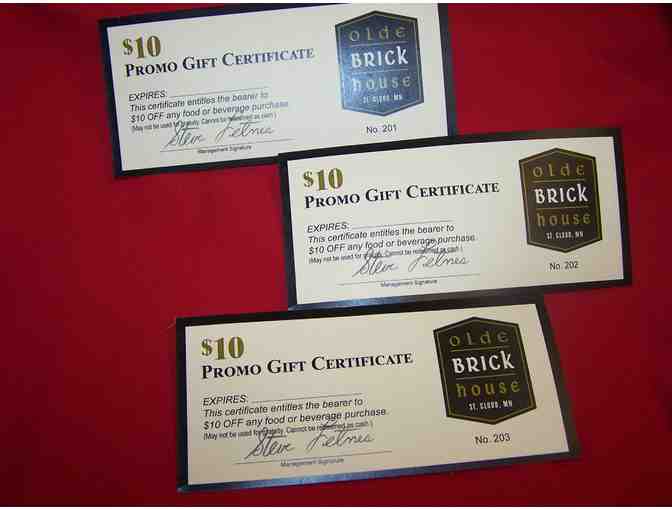 Three $10 gift certificates for Olde Brck House Irish Pub in Downtown St. Cloud!