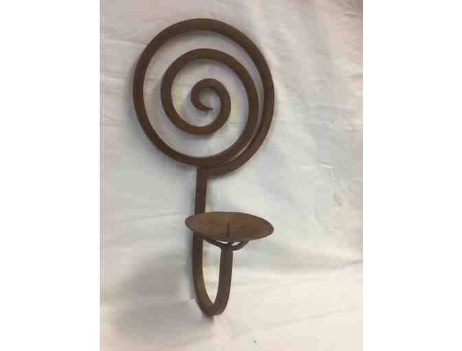 Wall mounted antique iron candle holder. Iriginally from the missionaries along the California coast. Size approximately 16" high x 9" wide.