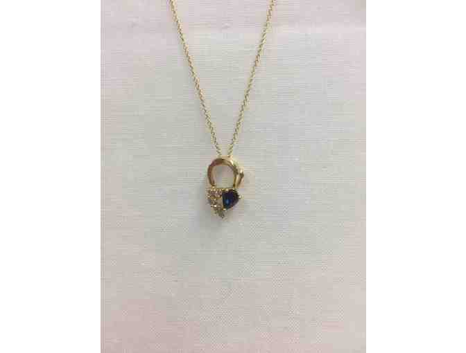 Ladies 14 kt yellow gold blue sapphire and diamond pendant. The diamonds have a total weight of .09 carat. Includes certificate of appraisal.