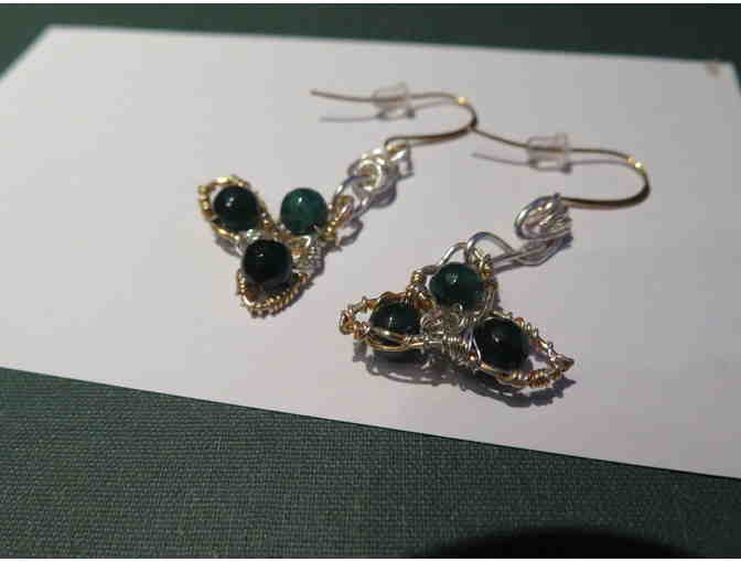 Handmade earring with a total of six faceted dyed jade beads (natural), Sterling Silver plated wires some which are were dipped in 24K gold color, Silver plated wire, and gold plated ear wires.