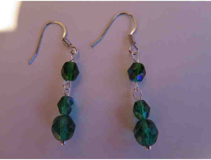 Handmade earrings with a total of four 6mm faceted green fire polished glass beads and a total of two 8mm faceted green fire polished glass beads, all the findings are silver plated expected the ear wire.