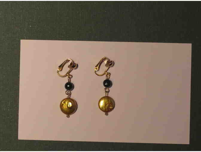 Handmade earrings with gold colored freshwater pearl coins and faceted dyed Jade beads. All the beads are natural. All the findings are gold plated except the ear wires. Clip on earrings convertible to pierced.