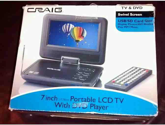 Craig 7-inch portable TV and DVD player. LCD 7 in. TV with swivel screen, DVD player, digital tuner, rechargeable battery, stereo speakers, headphone jack, USB port. Accessories include telescoping antenna, remote control, car adapter, AV cable, AC adapter, earbuds.
