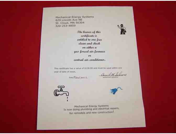 Get ready for summertime heat with a clean/check of your gas forced air furnace or Air Conditioner from Mechanical Energy Systems. Must be used by February, 2018.