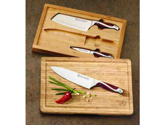 A high-quality set including a 7" Asian cleaver, an 8" chef knife, and a 3 1/2" paring knife in a gorgeous bamboo case that doubles as a cutting board.