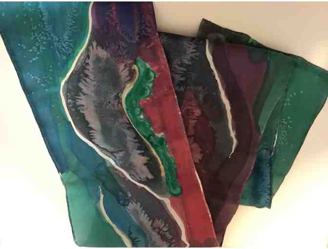 Silk scarf hand-dyed by Synergy grandmother and artist, Heather Solway. Green, blue, purple, and magenta, with hints of gold. 4.3 feet by 8 inches.
