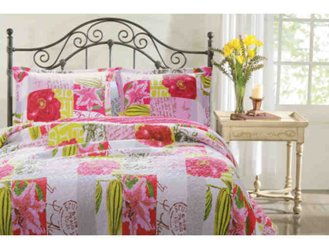 The Love Letters quilt set features roses, postage stamps and handwritten notes of affection in scarlet, pink and spring green on a white ground and is reversible to a coordinating floral leaf print.