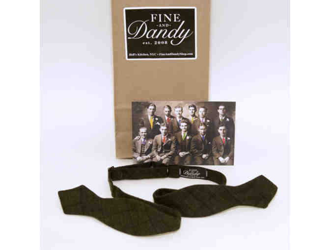 Green-checked wool bow tie from Fine and Dandy, purveyors of accessories for dapper guys. Self-tie, 2" bow. Adjustable from 13 3/4" to 17 1/2". 100% wool. Handmade in NYC.
