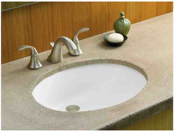 Delta Cassidy 24 in. towel bar with chrome finish plus White Kohler Caxton K-2210 model sink under-mount design with mounting clips (19.25x16.25 in.).