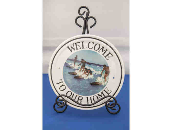 Take home this decorative ceramic plate to bring a beachy vibe to your home exterior. Decorated with "Welcome To Our Home" and a painted, vintage surf scene. Cottage Plates are kiln fired ceramic plates, ten inches in diameter. They are often used as welcome signs and address plaques placed near the entrance of your home. Imagination has also placed them in one's garden, kitchen, workshop, childs room, playhouse, or store. They are the perfect gift for weddings, house warming parties, or the purchase of a new home.