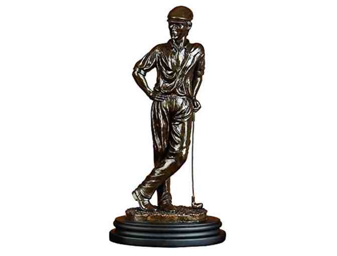 This statue is a wonderful addition to the home/office of golf enthusiasts. It depicts a golfer, leaning on his club, waiting to drive his next shot. Made of cold cast resis. The bronzed finish emphasizes the detail of the piece, from the folds in the golfer`s clothing to the texture of the grass. This piece looks great anywhere in your home or office, and makes a thoughtful gift for a friend.