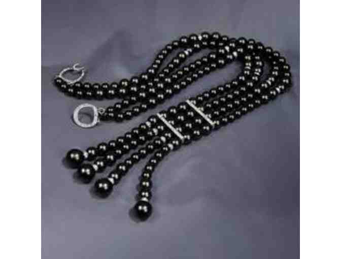 Four strands of alluring black shell pearls ingeniously come together in a dramatic vertical fall via a pair of streamlined pave crystal clasps. Accent beads and sparkling crystal closures complete the drama. As eye catching as it is collectible, this 29'' necklace from Kenneth Jay Lane perfectly illustrates the designer's masterful style. You'll get the applause!