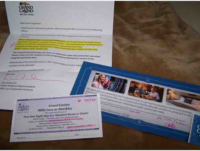 Enjoy a one night stay for two at Grand Casino. Sunday thruThursday night stay between now and September 1, 2017. It may be your lucky day!