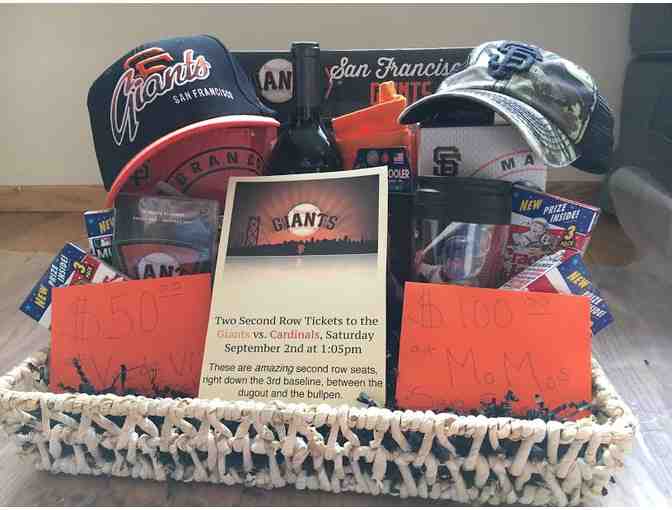 Dont miss this amazing pair of SF Giants tickets. They are second row seats, right down the 3rd baseline, between the dugout and the bullpen. To get your date night started off right you will also have a $50 gift certificate to Va di Vi in Walnut Creek, a nice bottle of wine and some classic baseball snacks to get you in the mood for the game. Once you get into town you can stop off at MoMo's right across from the stadium and use your $100 gift certificate for food and drinks. Giants memorabilia is also included so you can really get into the spirit as you chant _Lets Go Giants! Estimated value to be $450.