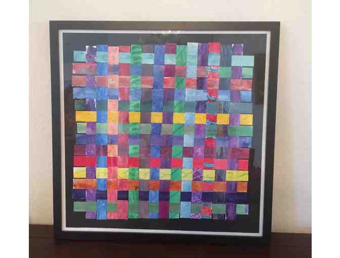 Miss Gayrards friendship quilt was made by weaving together strips of paper from water colored paintings made by the 3rd grade class. The friendship quilt has been mounted and placed into a black frame to enhance and protect the quilt. Memories of friends made during this school year will last for years with this fun paper _quilt.