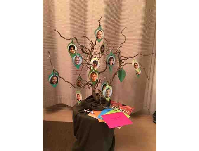 A living tree, Harry Lauder's Walking Stick or Corylus avellana 'Contorta' (a.k.a. Own Root), adorned with leaves featuring the kids of Mrs. Smith's First Grade class. Included within the book, "A Tree for All Seasons", are four $50.00 gift cards, each one to help you celebrate the changing of the seasons along with your tree!