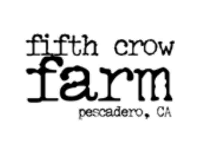 This August, experience the best produce the season has to offer with a weekly vegetable share from Fifth Crow Farms. Fifth Crow Farm grows a large diversity of products and each share contains an assortment of what they grow. From beets & leeks to lettuce & baby greens, from dry beans to pastured eggs, from blackberries, strawberries & rhubarb to apples & pears... They pride themselves in producing the highest quality and most nutritious food possible while continuing to build their soils and improve the farm for future generations of farmers and eaters. All food from the farm is certified organic by CCOF and Fifth Crow Farm is Bee Friendly Farm certified. The Baywood Auction has arranged a special one-month subscription to Fifth crow farms Weekly vegetable Share program. With a weekly vegetable share, you will pickup a share of vegetables from a designated location, like the San Mateo Farmers market. Here is what you can expect in your Veggie box: Baby head lettuce / bunching greens (varieties vary week to week), a root crop (carrots, beets, turnips, or radishes, potatoes), a bag of pre-washed baby greens (baby arugula, mesclun salad mix, or spinach), a brassica (broccoli, cauliflower, kohlrabi, or cabbage), an allium (leeks, onions, shallots or spring onions), two baskets of strawberries (albion) or blackberries, and in the fall, apples from our 27-variety heirloom orchard, and hopefully pears from our new pear orchard, an herb (dill, cilantro, basil, thyme, oregano, sage, etc.) PLUS another 1 3 seasonal items: summer squash, winter squash, tomatoes, padrone, poblano, or sweet peppers, green beans, tomatillos, and more You will also receive a pound of seven different varieties of heirloom dry beans. You can learn more about our CSA at: http://fifthcrowfarm.com/csa/