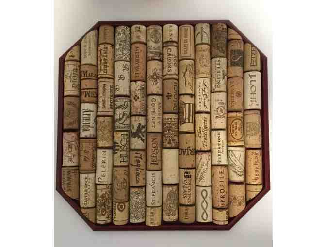 Two trivets trimmed with wood and filled with corks from a variety of wine bottles. Handmade by Nina and Marcus Abramsteins's grandfather, who makes and donates these attractive, dinner plate sized octagonal trivets to a variety of causes and friends on a regular basis.