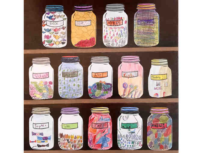 This year, the Rainbow Room created mason jar cupboards. They brainstormed what one might put in a mason jar and drew it on a template. The drawing was colored with colored pencil and their name was added to the label. The jar was cut out and glued to a simple background that I painted in acrylic. Several coats of varnish were added on top to seal all the pieces in. Please bid! These colorful works of art will give you joy for years to come. (Work is on display in the front hallway!)