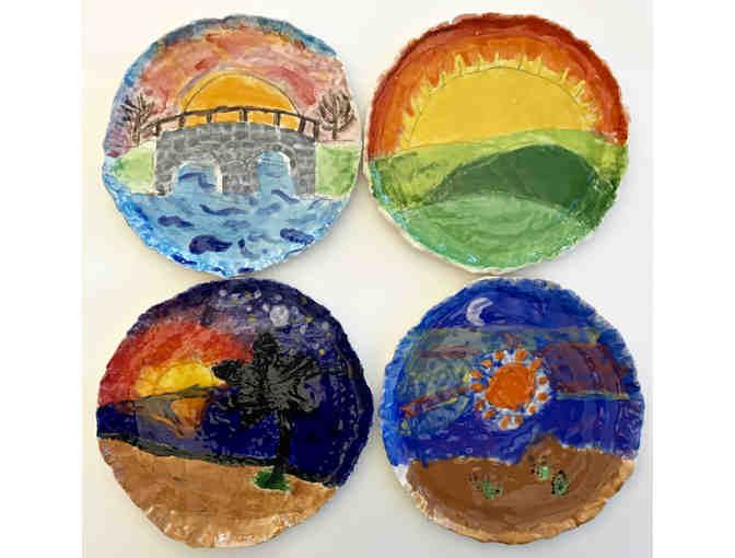 The 6th graders worked in groups of 3 or 4 to roll and form clay to make their own dinner plate. They used a template so the plates would be uniform. The class went through the slow process of brainstorming ideas for a theme and voting for their favorite. The themes ended up being “sunsets” and “cartoon characters”. Each group (randomly chosen) decided on how they would express this theme on their plate. The only rule was that they all needed to be different somehow. After being fired, the ideas were sketched on the template then drawn on the bisqueware. The plates were carefully glazed over 2 class periods. The underside was coated with clear glaze for protection. Yes, they are safe to eat off of, but I would be very careful with them when washing.