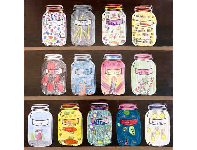 This year, the Rainbow Room created mason jar cupboards. They brainstormed what one might put in a mason jar and drew it on a template. The drawing was colored with colored pencil and their name was added to the label. The jar was cut out and glued to a simple background that I painted in acrylic. Several coats of varnish were added on top to seal all the pieces in. Please bid! These colorful works of art will give you joy for years to come. (Work is on display in the front hallway!)