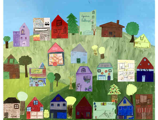 This year, the Eastenders and Skylights created villages. They chose a colored piece of paper, drew with colored pencil and trimmed the edges to make a building. Early finishers made trees. The buildings were glued to a simple background that I painted in acrylic. Several coats of varnish were added on top to seal all the pieces in. Please bid! These colorful works of art will give you joy for years to come. (Work is on display in the front hallway!)