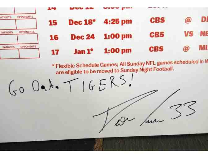Dion Lewis signed this football and poster at an Oakes Ames Hall event in Easton on 2/23/17. Lewis is the first player in NFL history to score rushing, receiving, and kickoff return TDs in a playoff game (1/14/17 vs. Texans). The poster is mounted on 39x26 in. backer board, signed `Go O.A. Tigers` above Dion`s name.