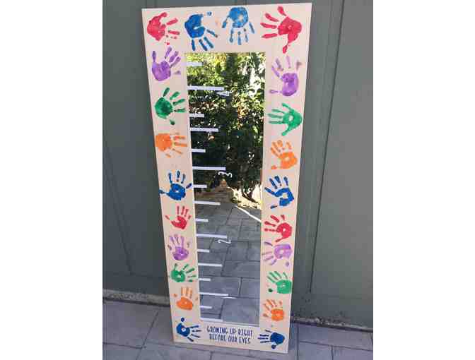 Door size mirror with each child's handprint and the saying "Growing Up Right Before Our Eyes" and lines for measuring kids height.