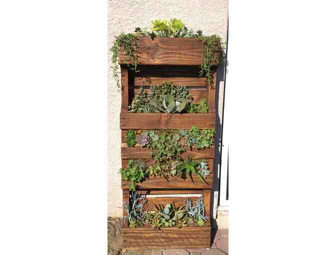 This beautiful piece began as a simple shipping pallet. It has been finished with an american walnut stain and Thompsons Water Seal to ensure years of use, indoor or outdoor, for the lucky winner. The planter houses over 40 different types of succulents contributed by the students in Ms. Fahey's fifth grade class. The colors are spectacular and flowers are starting to appear! Good luck! Bid high!