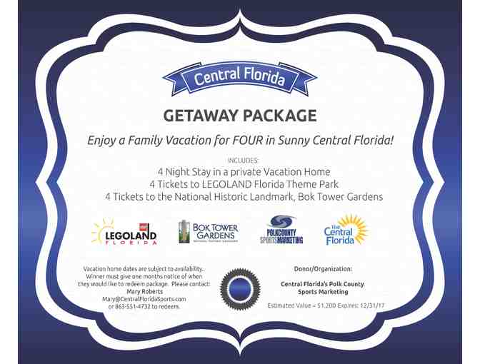 Enjoy a Family Vacation for FOUR in Sunny Central Florida! 4 Night stay in a private vacation home. 4 tickets to Legoland Florida Theme Park. 4 tickets to the National Historic Landmark, Bok Tower Gardens. (expires 12/31/17)