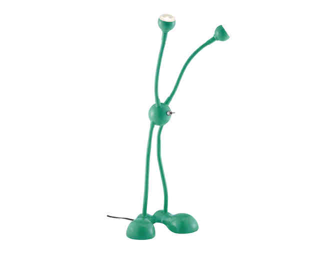 The playful Alien LED desk lamp has two gooseneck arms and legs which extend from a round torso that also holds a toggle switch "belly button". Two oversize plastic shoes comprise the base and provide stability. Each arm ends in an "eye" that contains a 3 Watt LED covered by a clear glass bubble lens.
