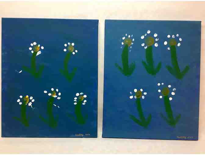 Here is your chance to own a unique acrylic-on-canvas diptych. Inspired by the amazing growth of the children in the class, this project was created with love, patience and each student and teachers' fingerprints as the daisy petals.