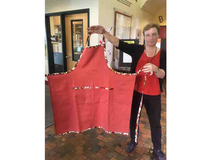 Beautiful burnt orange apron with floral trim & two front pockets.