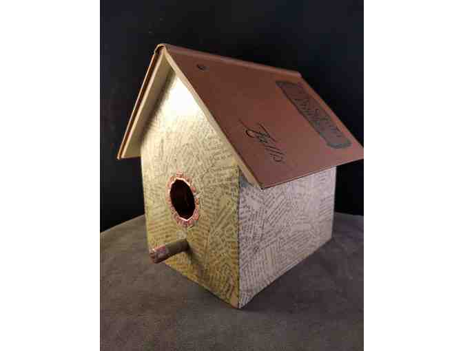 Are you a book-loving bird-lover? This house is a perfect gift for the ornithophile in your life. Pages from a vintage (unsalvagable) copy of Lewis Carroll's Through the Looking Glass were given a second life on the walls of this birdhouse. The roof is made from author, American educator, writer, poet, and toy designer, Edwina Hume Fallis's book on child development. This birdhouse is a good read and parenting advice all in one!