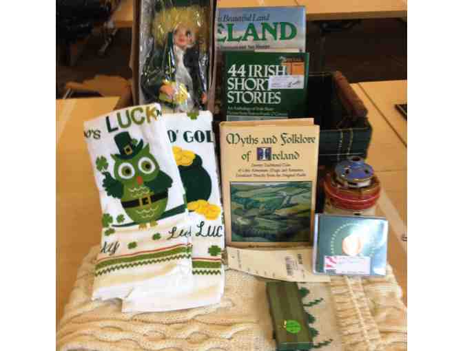 Irish gift basket with Aran isles knit scarf (valued at $60), Irish hand towels, linen handkerchief, leprechaun doll, 3 books on Ireland, ceramics. Donated by Marilyn Henderson of the Lions Club.