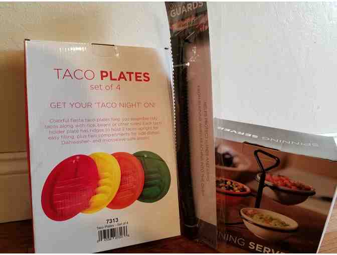 Do you need some extra kitchen Oven Rack Guards: Are you tired of burning yourself when reaching for the hot pan in the oven. Taco Plates: Is it Taco Tuesday!! Use these plates to hold your tacos for easy assembly. Spinning Server: Place your appetizer dips in these bowls and allow your guests to spin them around for easy access.